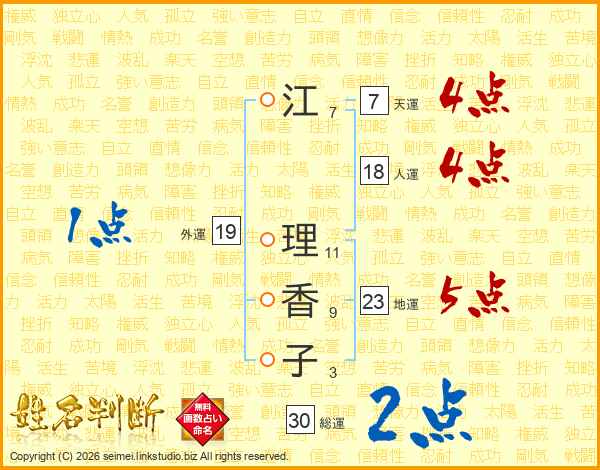 江(7画) 理(11画)香(9画)子(3画)