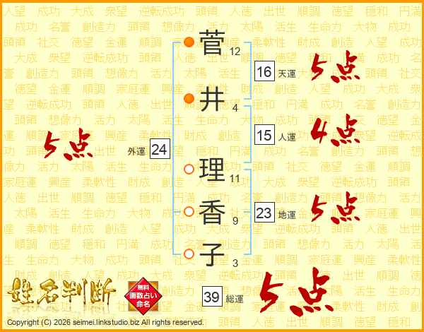 菅(12画)井(4画) 理(11画)香(9画)子(3画)