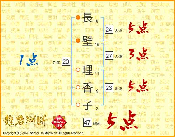 長(8画)壁(16画) 理(11画)香(9画)子(3画)