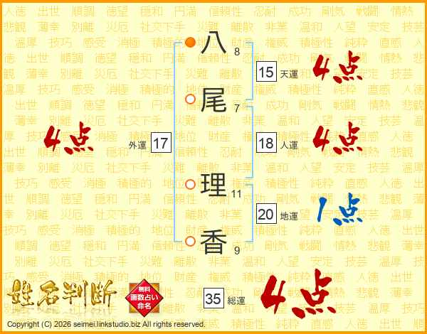 八(8画)尾(7画) 理(11画)香(9画)