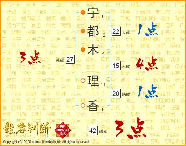 宇(6画)都(12画)木(4画) 理(11画)香(9画)