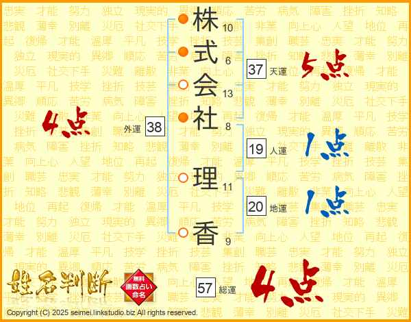 株(10画)式(6画)会(13画)社(8画) 理(11画)香(9画)