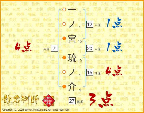 一ノ宮琉ノ介さんの総運は27画の3点!