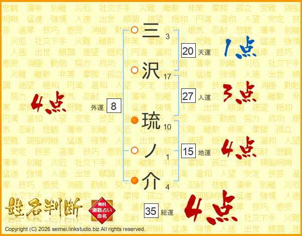 三(3画)沢(17画) 琉(10画)ノ(1画)介(4画)
