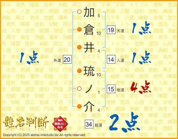 加(5画)倉(10画)井(4画) 琉(10画)ノ(1画)介(4画)