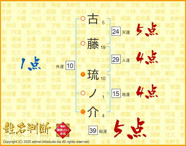 古(5画)藤(19画) 琉(10画)ノ(1画)介(4画)