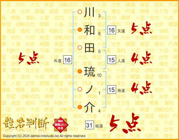 川(3画)和(8画)田(5画) 琉(10画)ノ(1画)介(4画)