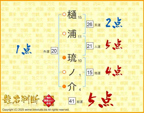樋(15画)浦(11画) 琉(10画)ノ(1画)介(4画)