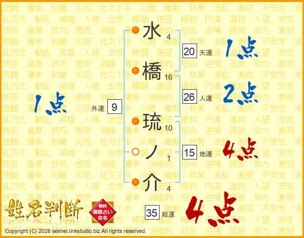 水(4画)橋(16画) 琉(10画)ノ(1画)介(4画)