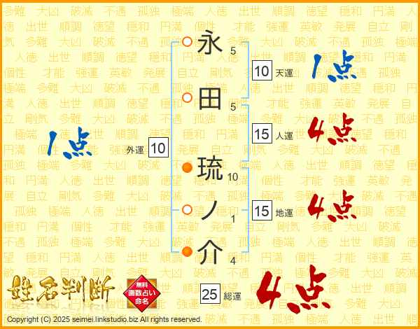 永(5画)田(5画) 琉(10画)ノ(1画)介(4画)