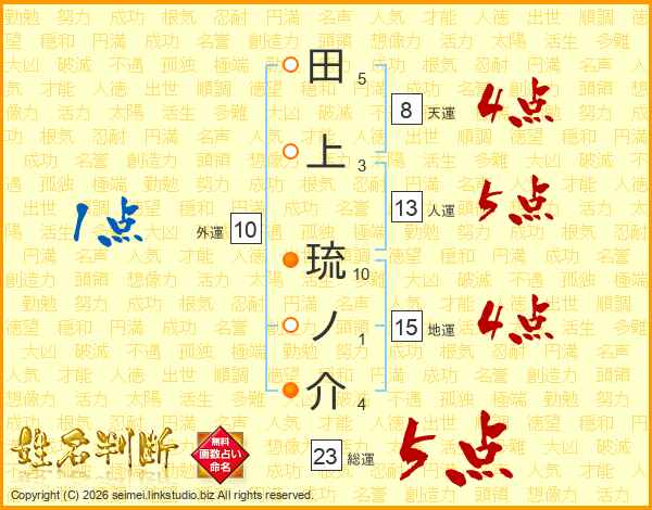 田(5画)上(3画) 琉(10画)ノ(1画)介(4画)