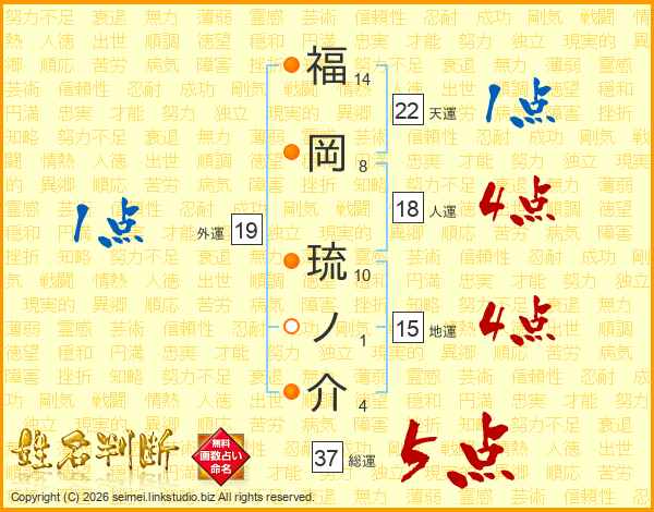 福(14画)岡(8画) 琉(10画)ノ(1画)介(4画)