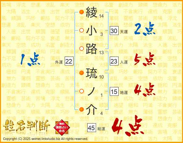 綾(14画)小(3画)路(13画) 琉(10画)ノ(1画)介(4画)
