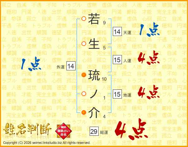 若(9画)生(5画) 琉(10画)ノ(1画)介(4画)