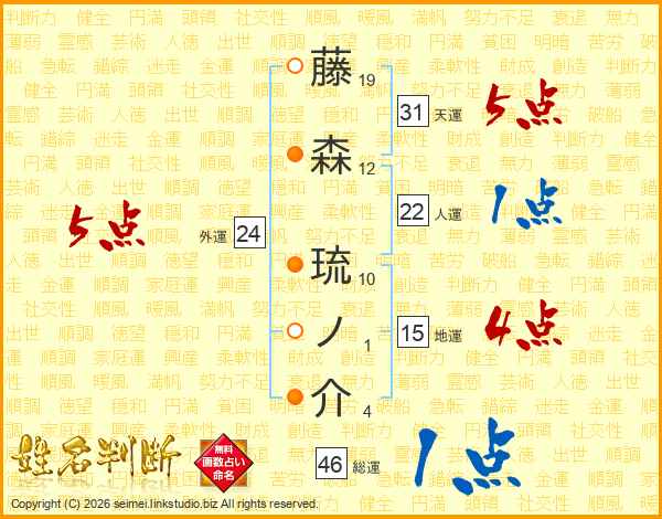 藤(19画)森(12画) 琉(10画)ノ(1画)介(4画)