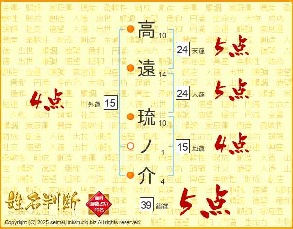 高(10画)遠(14画) 琉(10画)ノ(1画)介(4画)