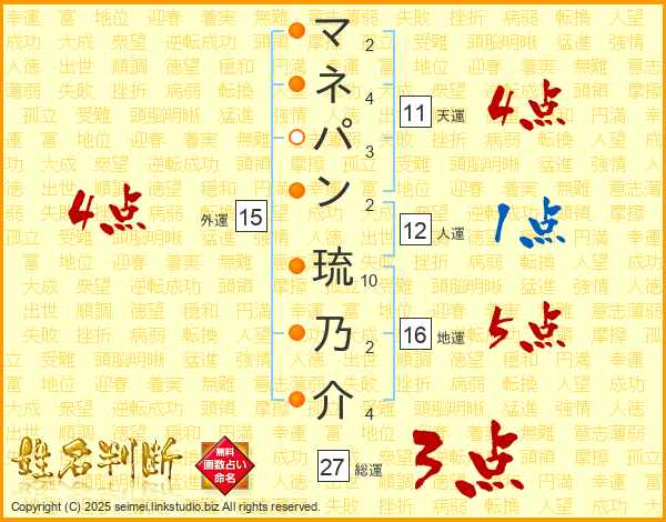 マ(2画)ネ(4画)パ(3画)ン(2画) 琉(10画)乃(2画)介(4画)