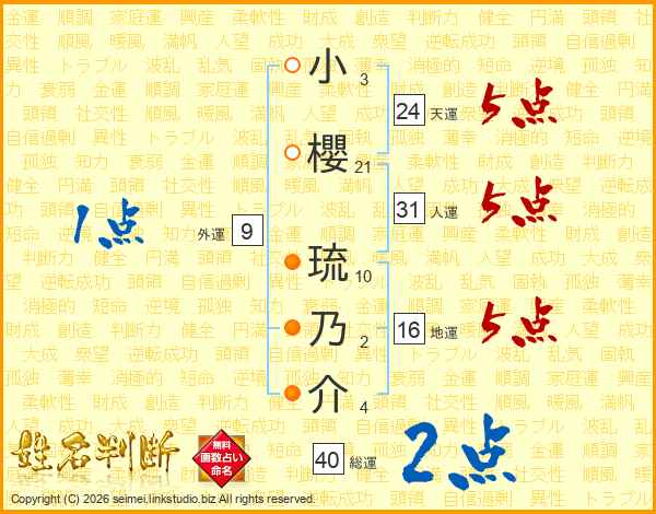 小(3画)櫻(21画) 琉(10画)乃(2画)介(4画)
