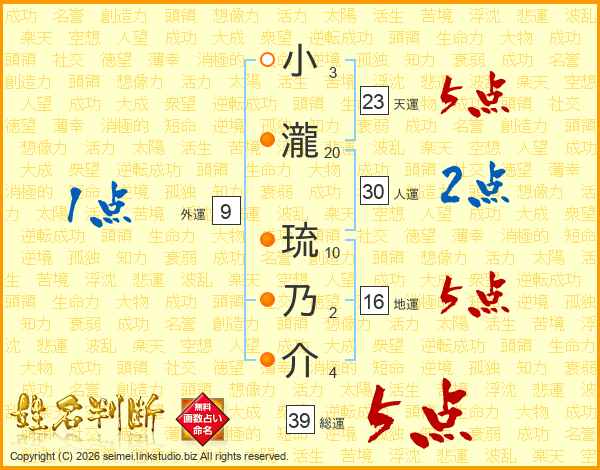 小瀧琉乃介さんの総運は39画の5点!