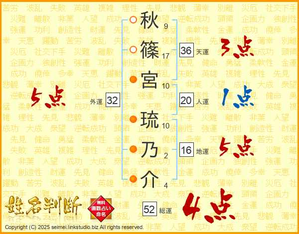 秋(9画)篠(17画)宮(10画) 琉(10画)乃(2画)介(4画)