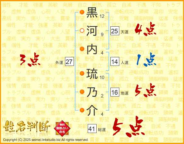 黒(12画)河(9画)内(4画) 琉(10画)乃(2画)介(4画)