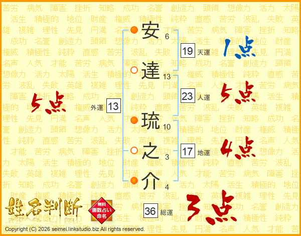 安(6画)達(13画) 琉(10画)之(3画)介(4画)