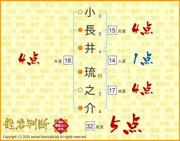 小(3画)長(8画)井(4画) 琉(10画)之(3画)介(4画)