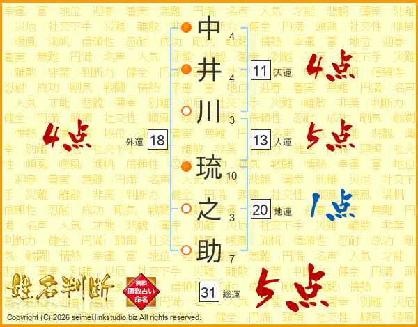 中(4画)井(4画)川(3画) 琉(10画)之(3画)助(7画)