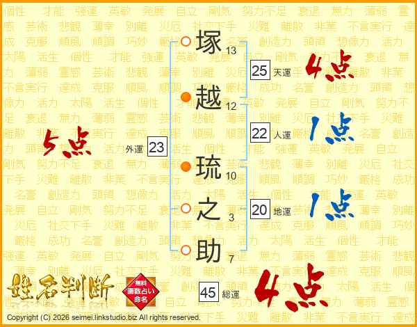 塚(13画)越(12画) 琉(10画)之(3画)助(7画)