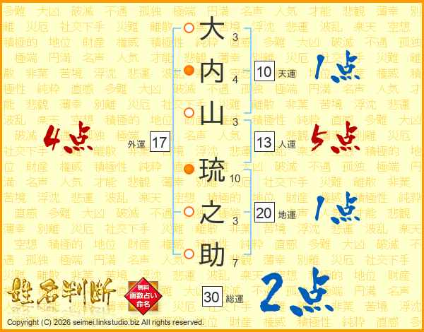 大(3画)内(4画)山(3画) 琉(10画)之(3画)助(7画)