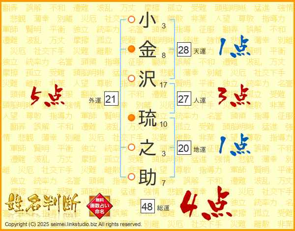 小(3画)金(8画)沢(17画) 琉(10画)之(3画)助(7画)