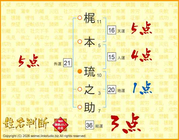 梶本琉之助さんの外運は21画の5点!