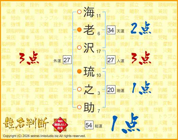 海(11画)老(6画)沢(17画) 琉(10画)之(3画)助(7画)
