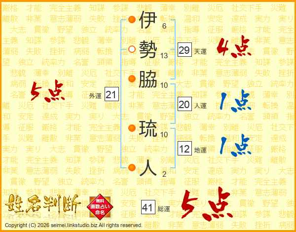 伊(6画)勢(13画)脇(10画) 琉(10画)人(2画)