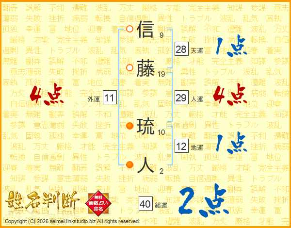 生活面を象徴する運勢です。外部から受ける影響力を表し、結婚運、家庭運や職場、環境への順応性を表します。総運から人運を引いた画数。姓や名が1文字の場合を除く。