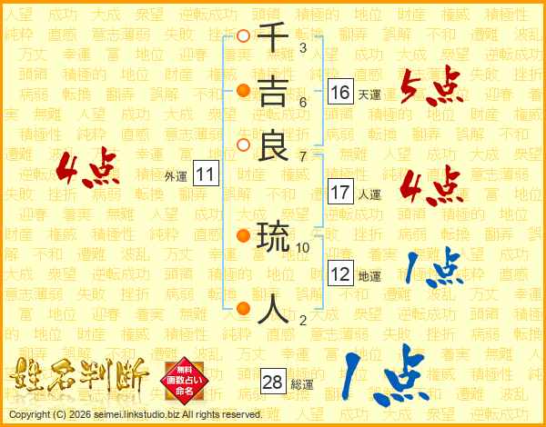 千(3画)吉(6画)良(7画) 琉(10画)人(2画)