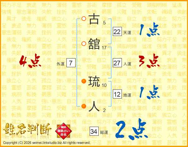 古(5画)舘(17画) 琉(10画)人(2画)