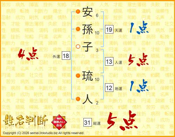 安(6画)孫(10画)子(3画) 琉(10画)人(2画)