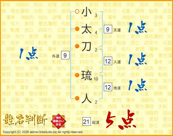 小太刀琉人さんの総運は21画の5点!