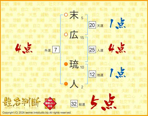 生活面を象徴する運勢です。外部から受ける影響力を表し、結婚運、家庭運や職場、環境への順応性を表します。総運から人運を引いた画数。姓や名が1文字の場合を除く。