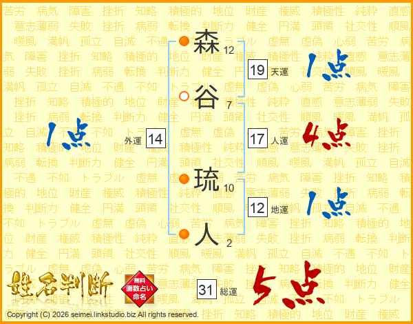 森(12画)谷(7画) 琉(10画)人(2画)