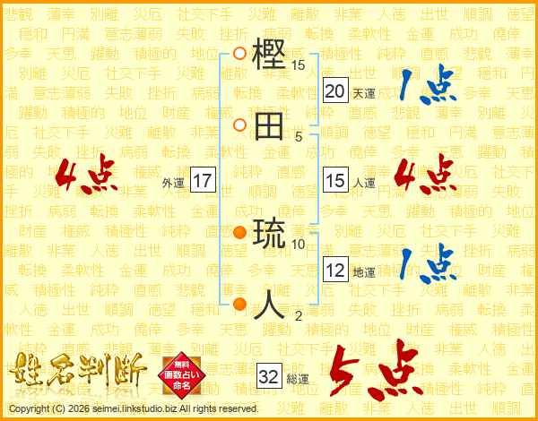 樫(15画)田(5画) 琉(10画)人(2画)