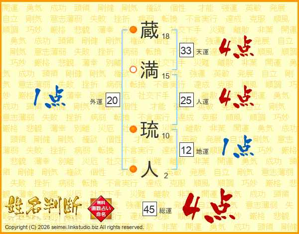 蔵(18画)満(15画) 琉(10画)人(2画)