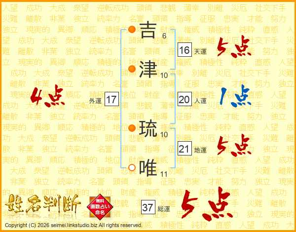 吉(6画)津(10画) 琉(10画)唯(11画)