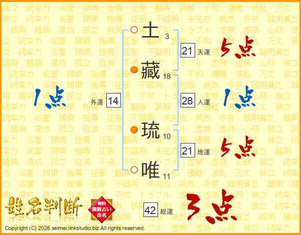生活面を象徴する運勢です。外部から受ける影響力を表し、結婚運、家庭運や職場、環境への順応性を表します。総運から人運を引いた画数。姓や名が1文字の場合を除く。