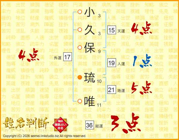 小(3画)久(3画)保(9画) 琉(10画)唯(11画)