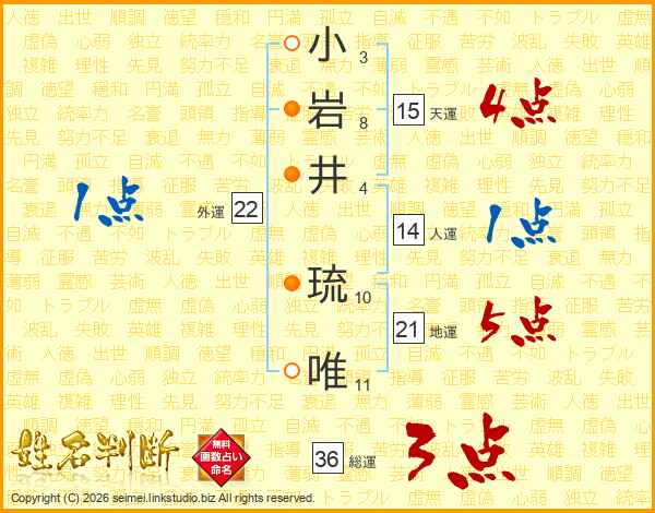 小(3画)岩(8画)井(4画) 琉(10画)唯(11画)