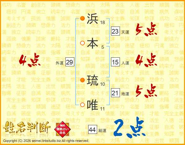 浜本琉唯さんの総運は44画の2点!