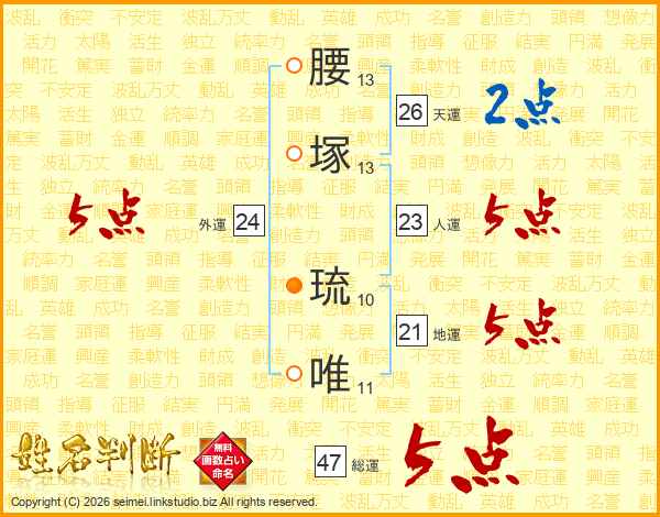 腰(13画)塚(13画) 琉(10画)唯(11画)