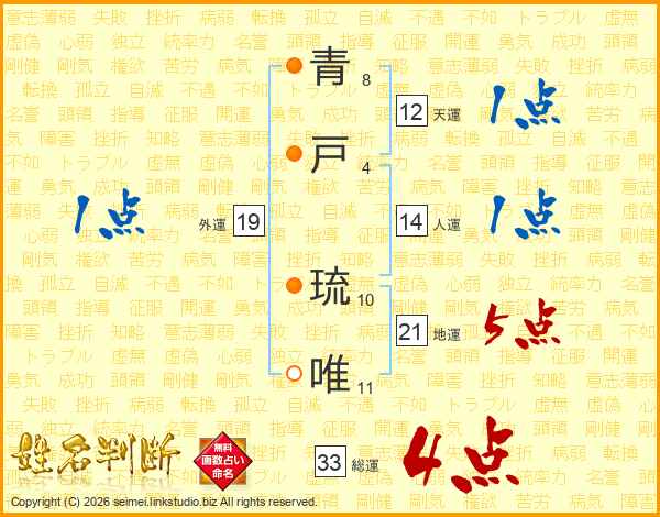青戸琉唯さんの総運は33画の4点!
